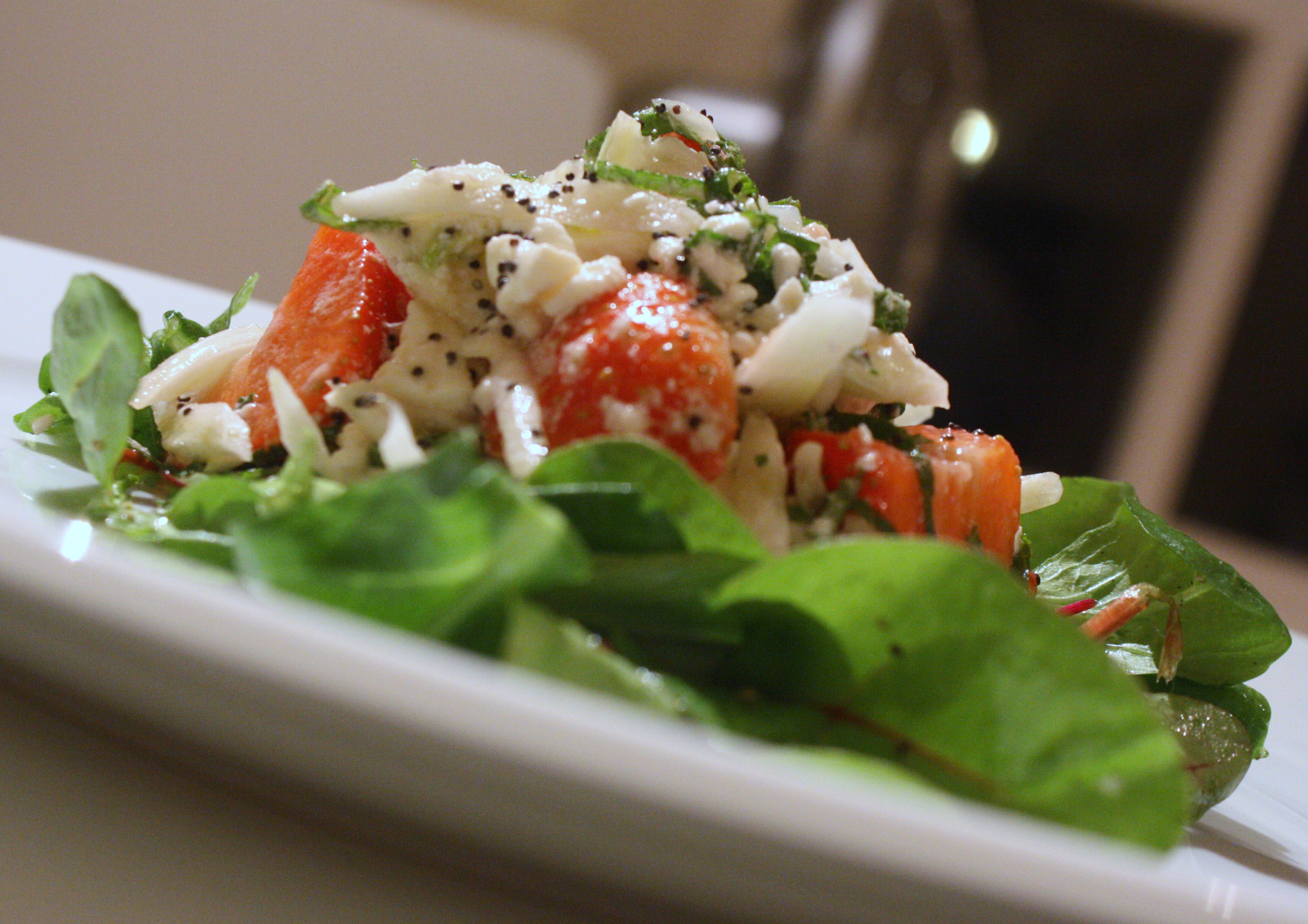 2) Place a bed of mixed leaves on a plate. Combine the rest of the ingredients and assemble on top of the mixed leaves.