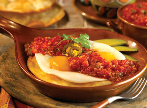 Many variations of Huevos Rancheros, a tradition of eating eggs and hot chile that dates back for centuries. The dish traditionally was served at the large mid-morning breakfast on rural farms where workers had a much smaller meal at dawn.