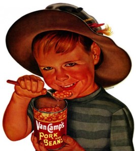 During the 1860’s the Indianapolis grocery store of Gilbert and Hester Van Camp, who canned fruits and vegetables for their own shop, obtained a U.S. Army contract during the American Civil War to can and ship pork and beans to the troops. Their son, Frank, is credited with the development of Van Camp’s canned pork and beans recipe, by adding tomatoes from the family’s preserved vegetable business to the traditional salt pork-based sauce. He discovered that pork & beans tasted even better when served hot in tomato sauce. He began to advertise this notion, and an American store cupboard favourite was born.