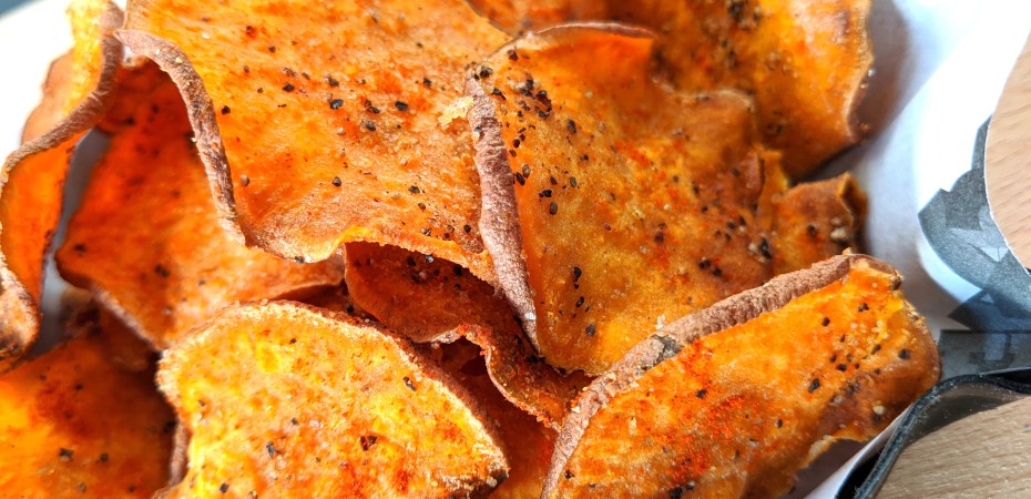 Baked sweet potato crisps are a wonderful healthy alternative to shop bought snacks. Sweet potato is a great source of fibre, vitamins and minerals, including antioxidants that protect your body from free radicals.