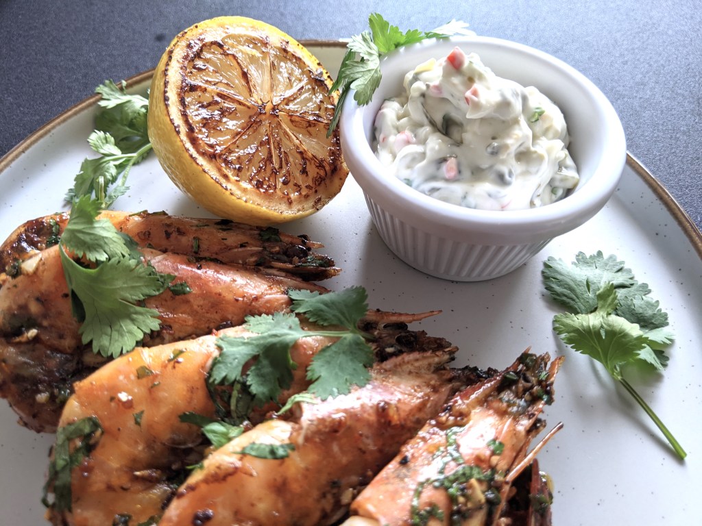 A spicy Creole tartare sauce pairs well with the prawns, providing a backdrop of creamy piquancy that compliments the naturally sweet flesh of the blackened prawns.