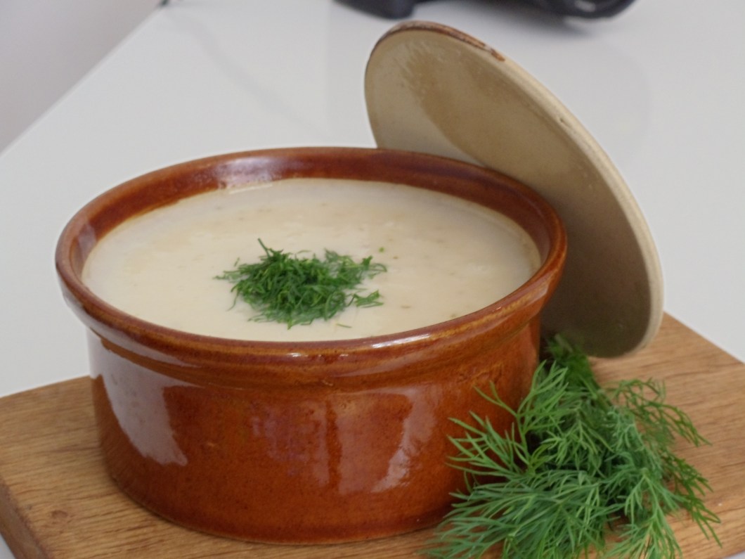 4. Add the potatoes, chopped celery leaves, salt and freshly ground black pepper and bay leaf, bring to the boil and simmer until the potatoes are tender. Then add the 50:50 milk and cream, and cook further for 3 – 4 minutes or until desired consistency. If the chowder is too thick, thin down with some milk.